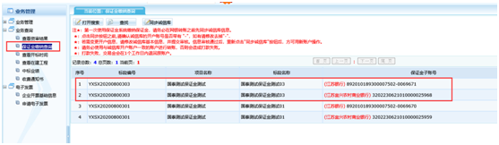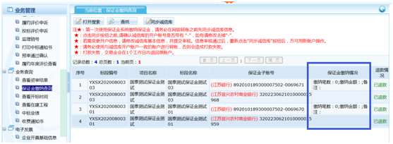 第四步:查看保證金到賬情況。確認(rèn)付款成功后,點(diǎn)擊業(yè)務(wù)管理模塊下“業(yè)務(wù)查詢”的“保證金繳納查詢”模塊,頁(yè)面上的保證金繳納情況字段下的是根據(jù)企業(yè)誠(chéng)信庫(kù)基本信息中的開戶賬號(hào)為判斷依據(jù),如果打款賬戶與基本賬戶一致,則會(huì)顯示出保證金繳納筆數(shù)與繳納金額。