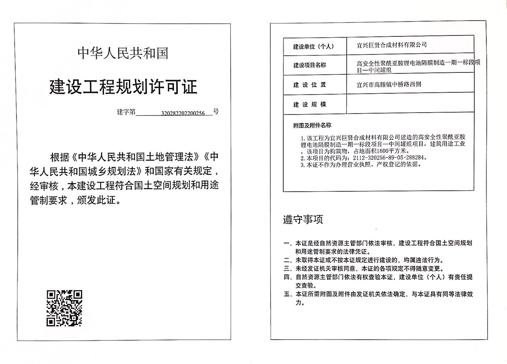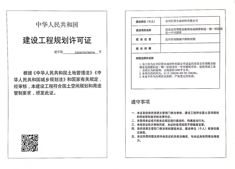 項(xiàng)目名稱:高安全性聚酰亞胺鋰電池隔膜制造一期一標(biāo)段項(xiàng)目—中間罐組 建設(shè)單位:宜興巨賢合成材料有限公司