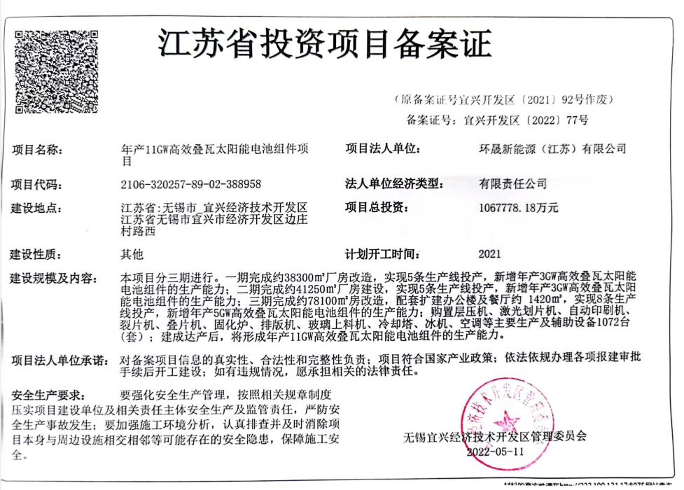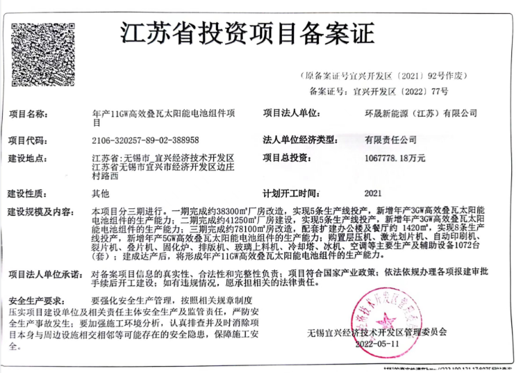 年產(chǎn)11GW高效疊瓦太陽(yáng)能電池組件