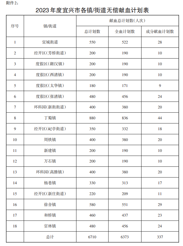 附件2:2023年宜興市各鎮(zhèn)/街道無償獻(xiàn)血計劃表