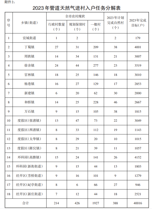 2、2023年管道天然氣進村入戶任務分解表;