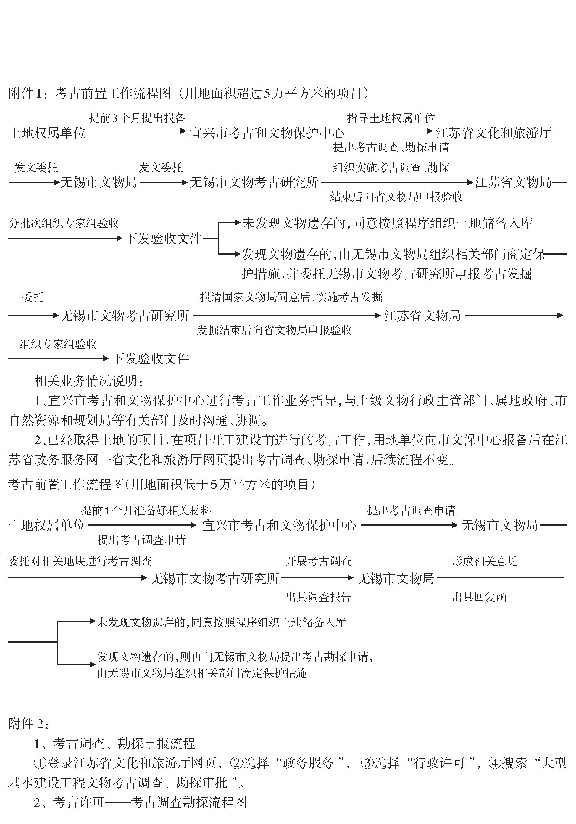 面積在5萬平方米以下的地塊,土地權(quán)屬單位可以提前1個月向市考古和文物保護中心提出書面申請,由市考古和文物保護中心向無錫市文物局申請考古調(diào)查。如在考古調(diào)查中發(fā)現(xiàn)文物遺存,則再向無錫市文物局申請考古勘探。市考古和文物保護中心在此過程中將進行相關(guān)業(yè)務(wù)協(xié)調(diào)。