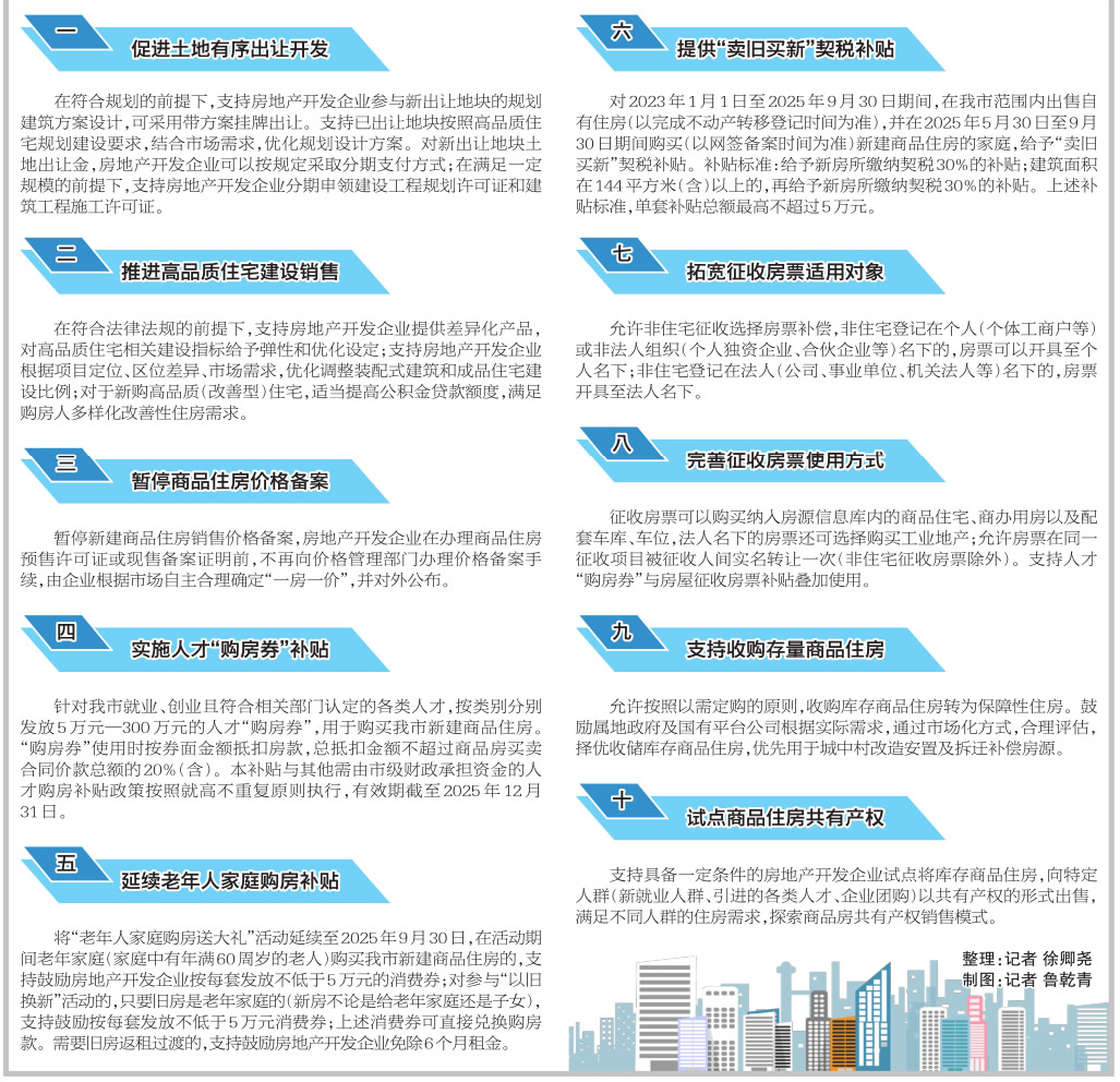 促進(jìn)土地有序出讓開發(fā)、推進(jìn)高品質(zhì)住宅建設(shè)銷售、實(shí)施人才“購(gòu)房券”補(bǔ)貼……6月1日,我市發(fā)布促進(jìn)住房領(lǐng)域消費(fèi)十條措施。市住房和城鄉(xiāng)建設(shè)局相關(guān)工作人員表示,此次出臺(tái)的十條措施,旨在從土地開發(fā)、住宅品質(zhì)、購(gòu)房補(bǔ)貼、房票使用等方面進(jìn)一步保障房地產(chǎn)市場(chǎng)健康發(fā)展,讓市民買房既省錢又安心。