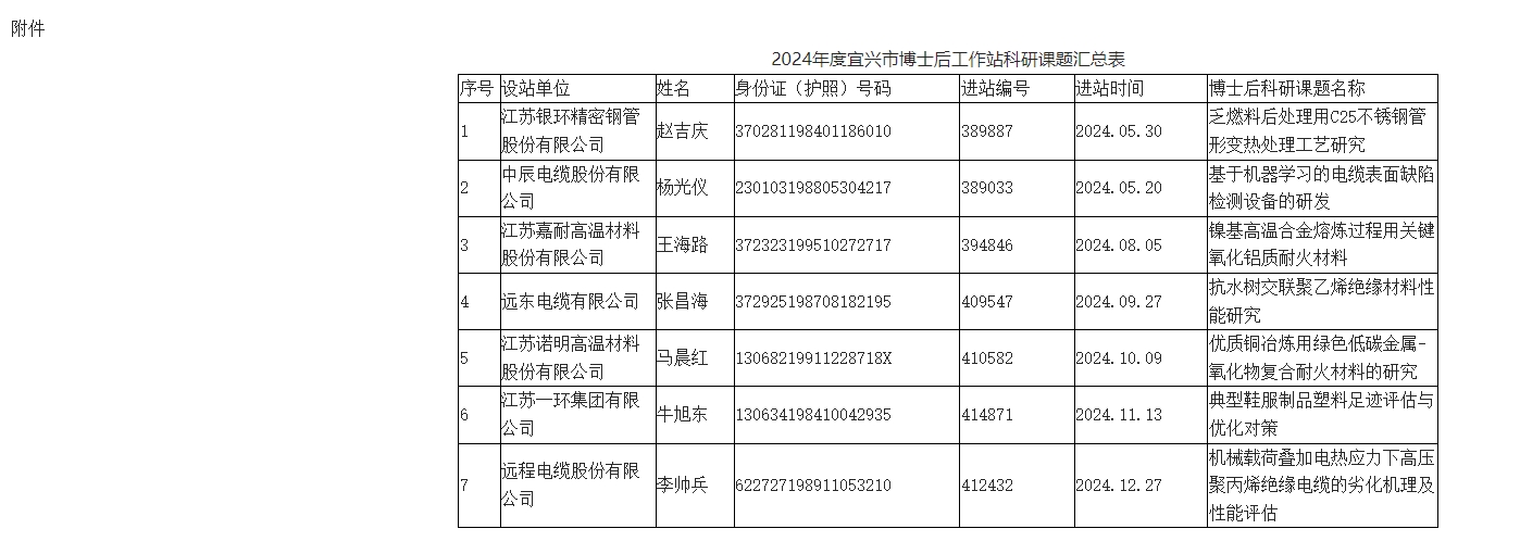 我市江蘇銀環(huán)精密鋼管股份有限公司等7家博士后科研工作站和省博士后創(chuàng)新實踐基地設(shè)站單位,于2024年5月至12月陸續(xù)引進了趙吉慶等7位博士后科研人員,目前已全部完成博士后科研課題的開題報告(詳見附件)。