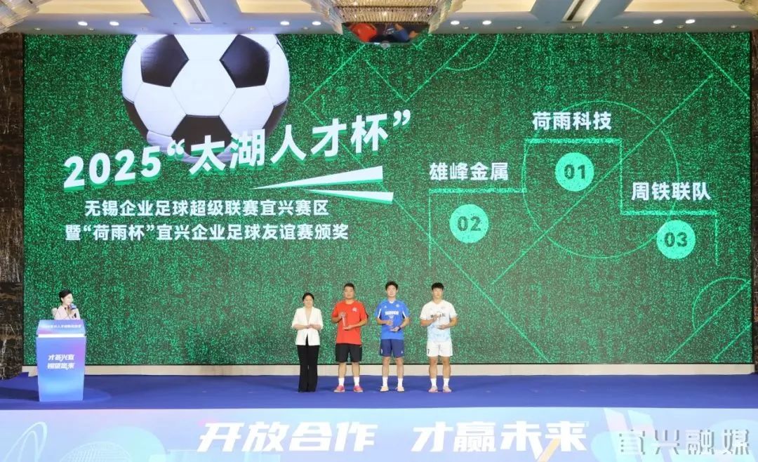 為獲獎球隊代表頒發(fā)了2025“太湖人才杯”無錫企業(yè)足球超級聯(lián)賽宜興賽區(qū)暨“荷雨杯”宜興企業(yè)足球友誼賽獎項。