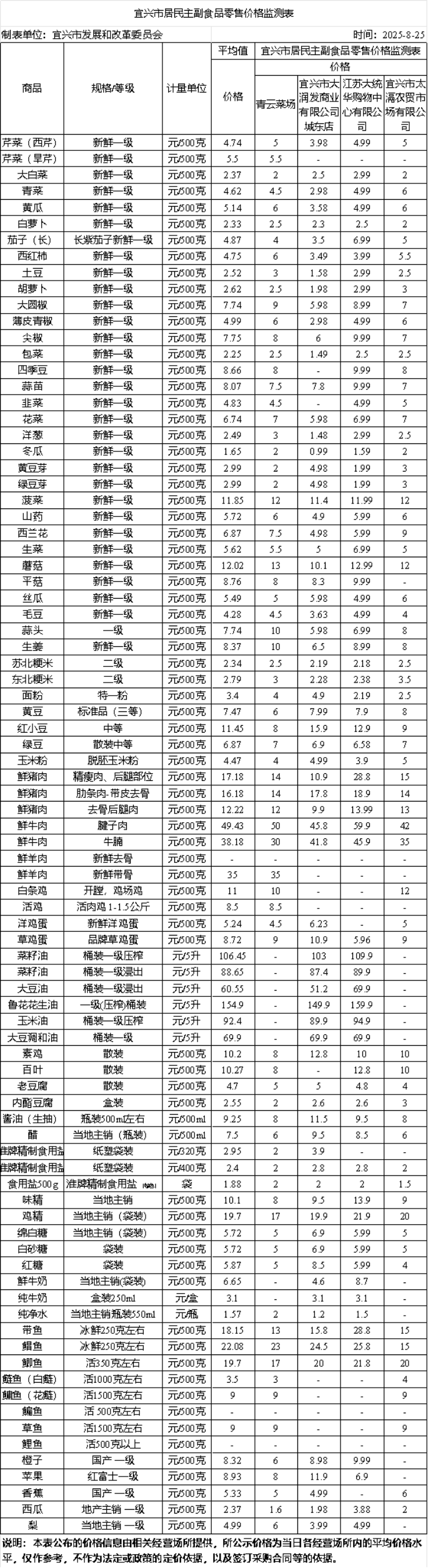 【農副產(chǎn)品】宜興市居民主副食品價格監(jiān)測表(2025.8.25)
