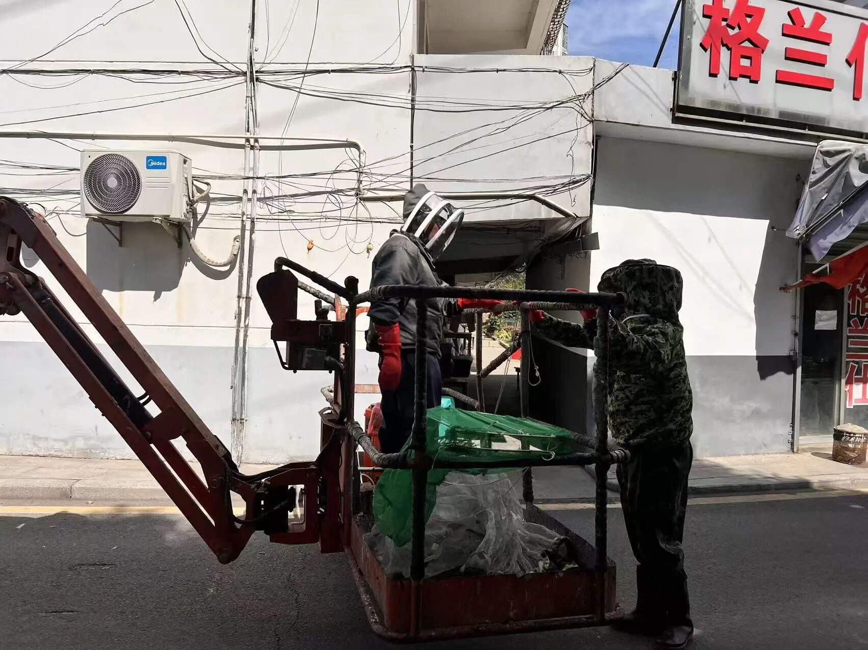 由于該馬蜂窩位置較高且涉及穿越供電線路,社區(qū)工作人員立即聯(lián)系屬地供電部門工作人員至現(xiàn)場共同商談處置方案,在確保電線不會對操作安全造成影響后,工作人員協(xié)調(diào)登高作業(yè)車輛,利用專業(yè)工具對蜂窩進行清除,快速高效地解決了這一突發(fā)問題。清除工作完成后,社區(qū)網(wǎng)格員及時協(xié)同物業(yè),對現(xiàn)場進行了全面細致的打掃,確保不留任何安全隱患。
